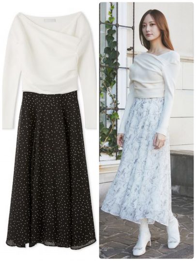 ニットの衿は肩を落としてオフショルダーやワンショルダーとしても着られるマルチWAY仕様。すっきりとしたウエストからふんわりフレアスカートが広がり、抜群のシルエットに。