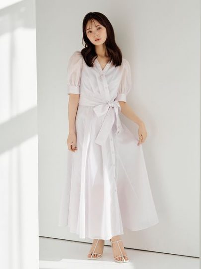 カシュクールデザインにバルーンスリーブで、ロマンティックに仕上げたシャツワンピース。ウエスト切替位置からフレアシルエットがふわっと広がり、1枚で主役級の存在感。ウエストにはベルトデザインを加えた長めの共布リボン付き。リボン結びで、好みのシルエットにウエストマークして。