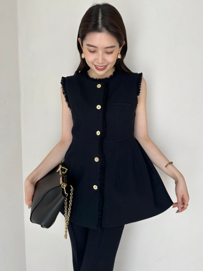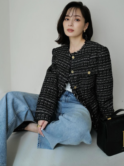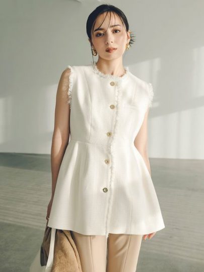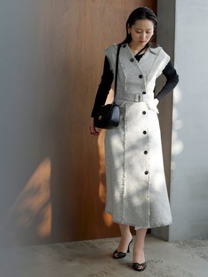様々なシーンで活躍するツイードジレ。立体的に広がるフォルムシルエットがスタイルアップも叶えてくれます。