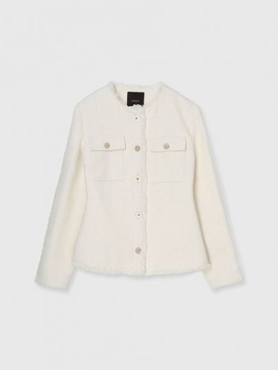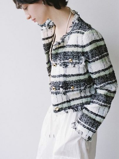 すっきりとした綿混の糸にキラキラとしたラメ糸・ミニスパンコール糸を加えた、きらびやかなツイードジャケット。ホワイトベースに黒やミントなどの爽やかなカラーを入れた大胆なチェック柄が印象的です。衿ぐりや袖口、裾や飾りポケットのフリンジが洒落感たっぷり。