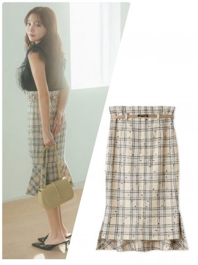 ツイードチェックのマーメイドスカート。今季らしいバランスを叶えるミディ丈を取り入れ、裾は前を短く、後ろをやや長く、前後差をつけて女性らしい仕上がりに。ハイウエストにはセットの細ベルトでメリハリを出し、美脚効果も抜群。サイドスリット入りだから足捌きも軽やか。