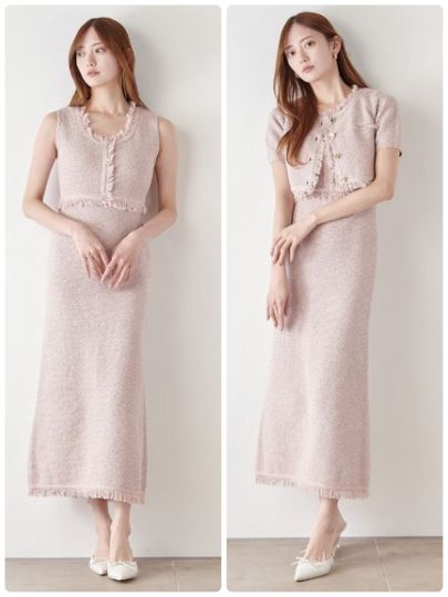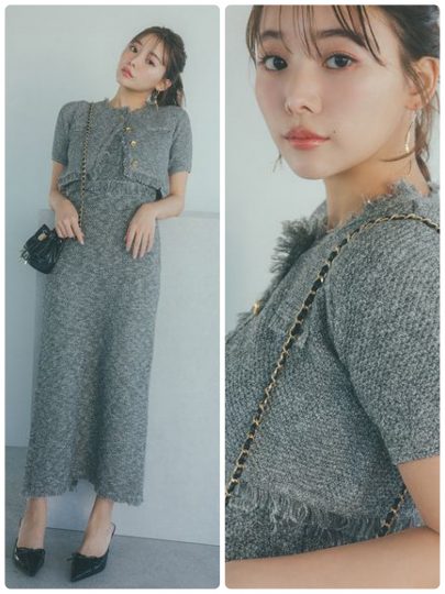春の訪れを感じるラメ糸入りのツイードニットワンピース。ボディラインにフィットするシルエットや、Vネックのデコルテ見せが女っぽ。襟ぐりや裾、ウエスト部分のフリンジディテールがこなれ感たっぷり。ショートジャケットは別売りです。
