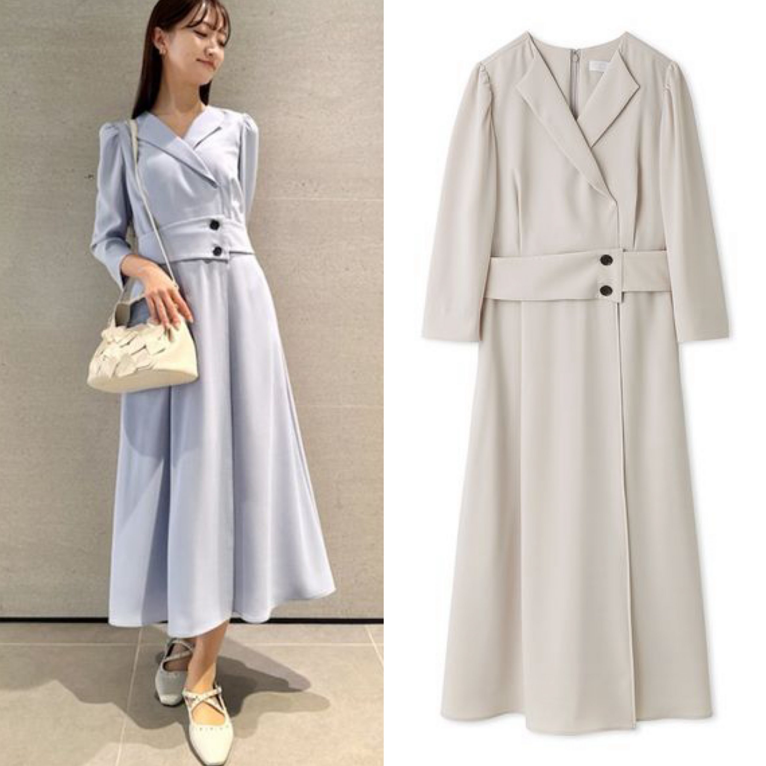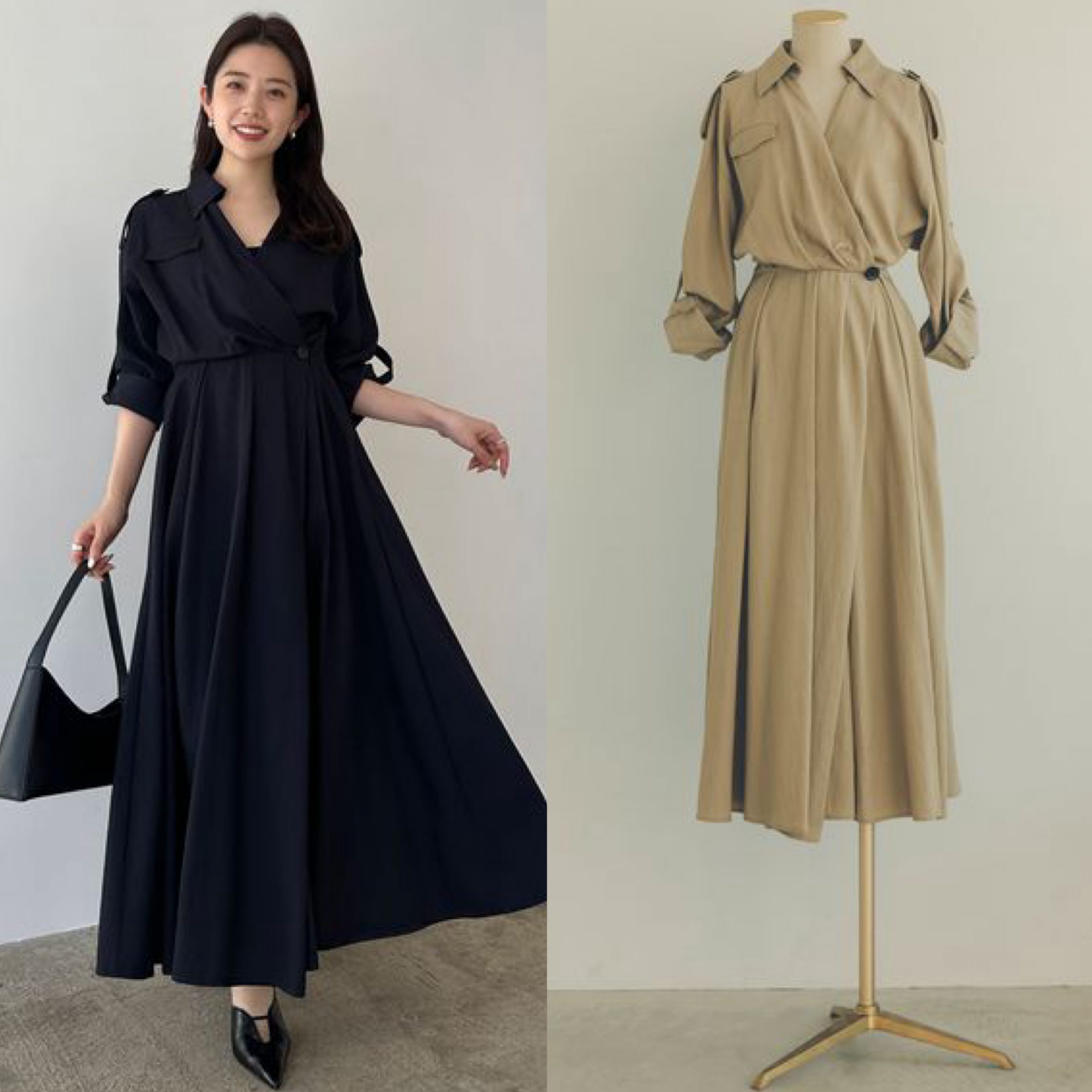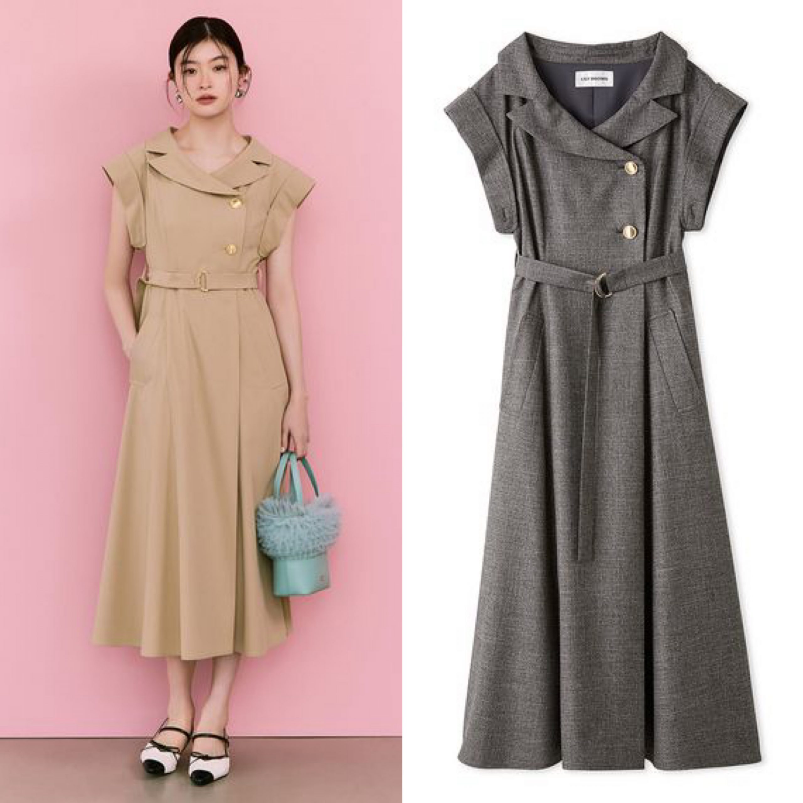 LILY BROWNはワンピースとして登場。すっきりと綺麗なデコルテをアピールできる、クラシックなデザイン。細見え効果も高め。デコルテトレンチワンピース/リリーブラウン