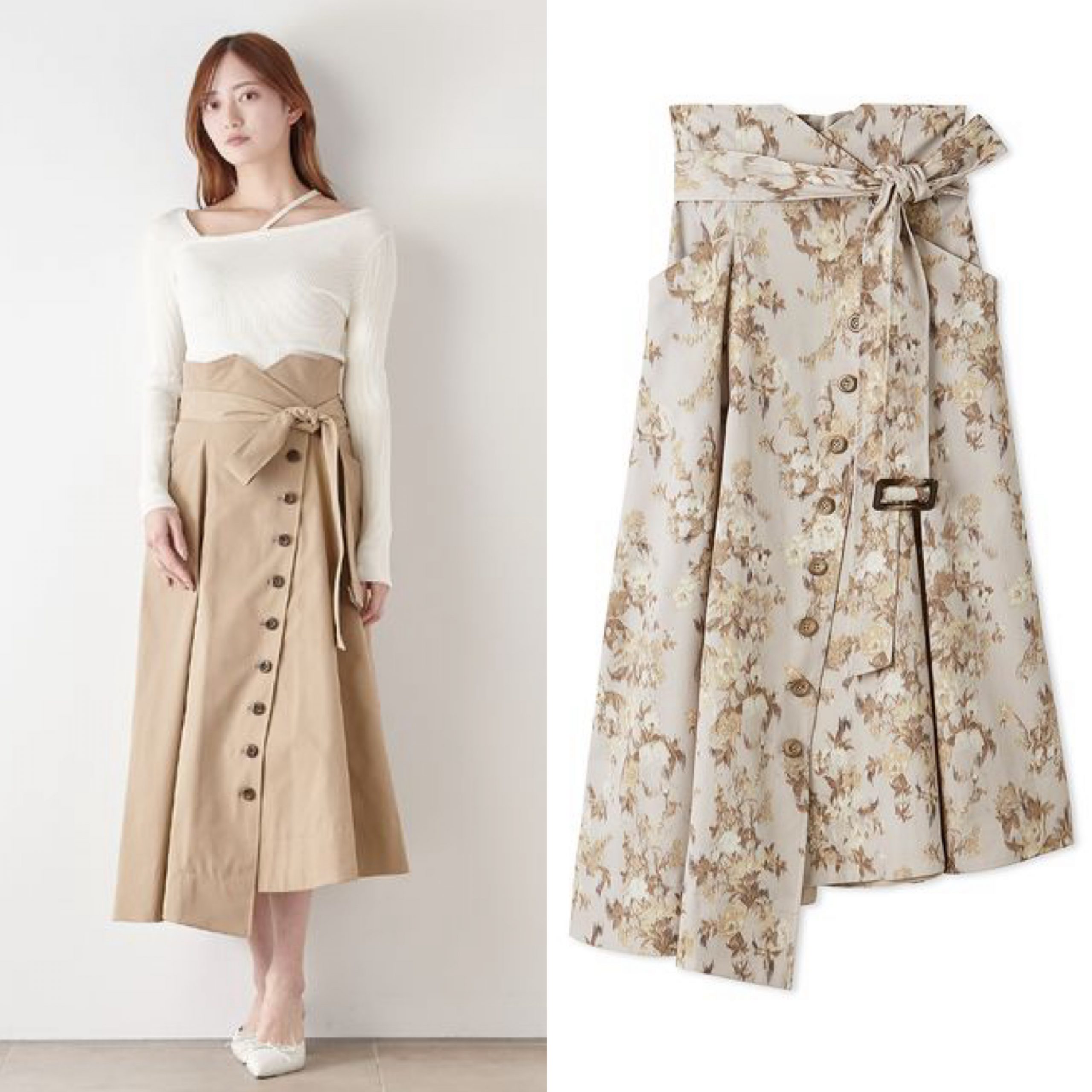 トレンチのディテールを取り入れた、ハンサムなスカート。アシメなバランスが大人っぽくて素敵。花柄も華やかで個性的。アシメトレンチスカート/SNIDEL