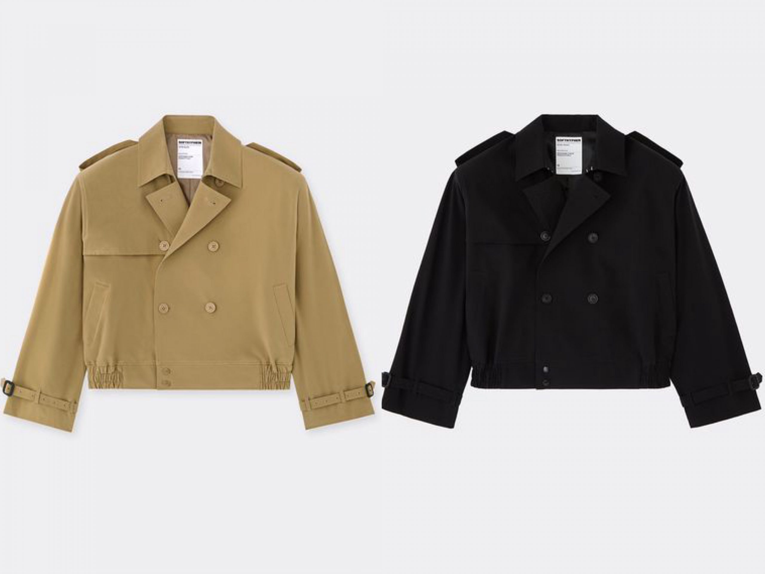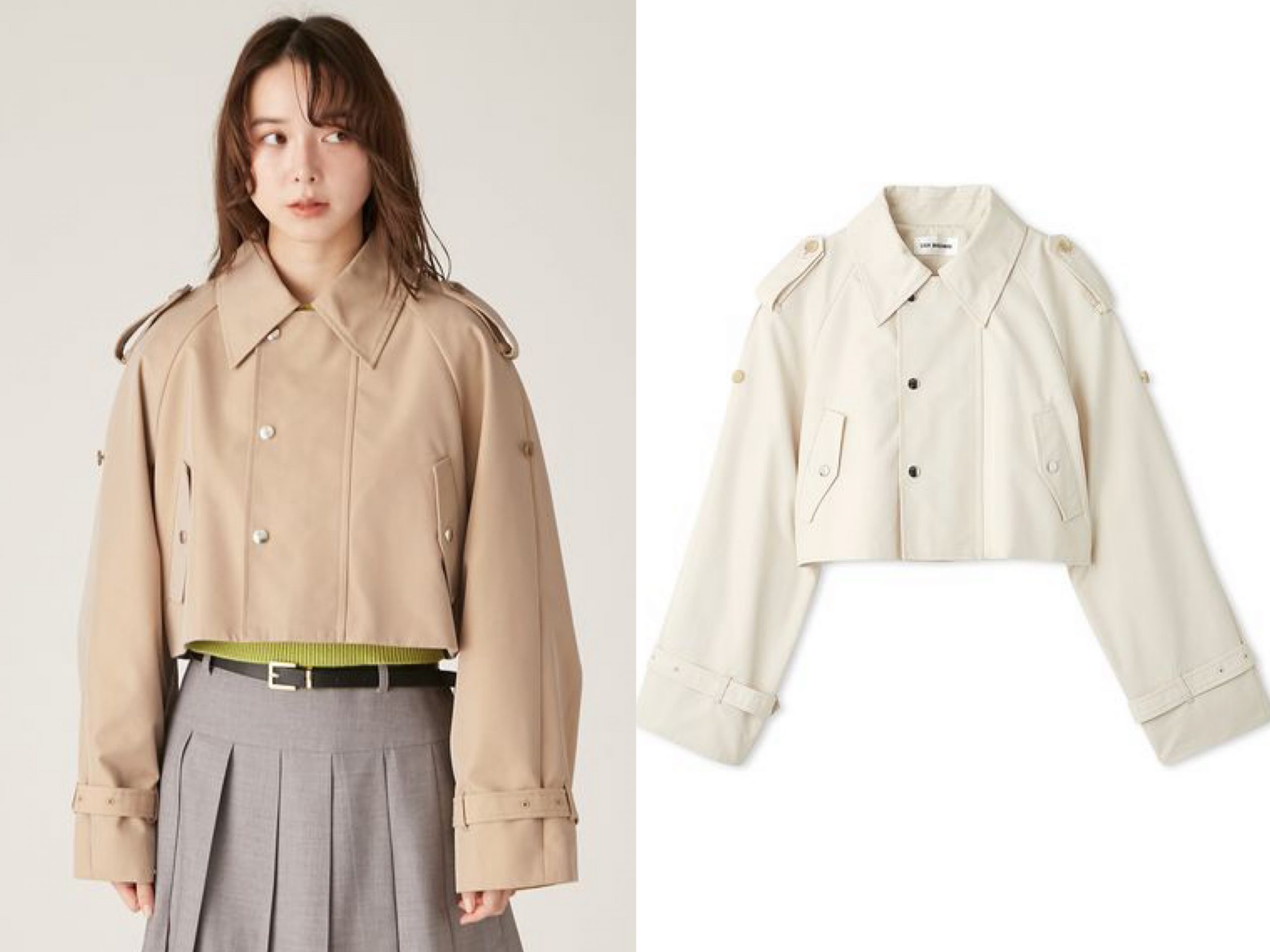 高級なタフタ素材で作られた、ユニセックスのショートトレンチ。ワンピースやスカートと合わせたい。PADDED SHOULDER TRENCH JACKET /ソフトハイフン