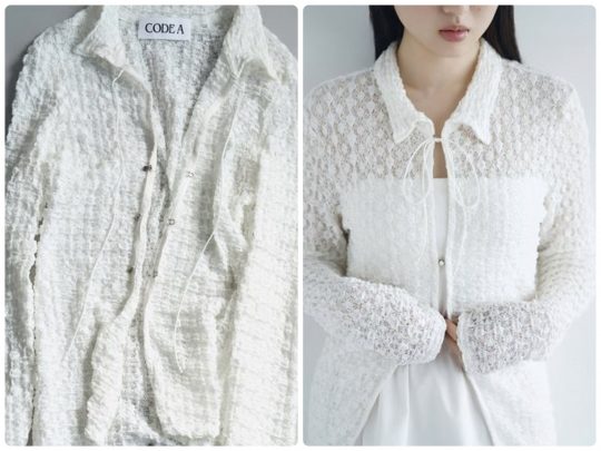 リラックス感ある着心地のレースブラウス。繊細なレースからほのかに覗く素肌が透明感を生み出します。前を閉じて着ても、開けて羽織りとしても着られるので、冷房対策としてもオススメ。