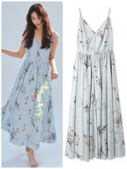 ドラマティックな印象を演出してくれる、ボタニカル柄プリントのキャミソールワンピース。寒色系でまとめた涼しげなミント系カラーは、春夏にピッタリです。