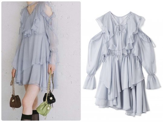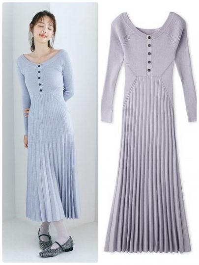 肌印象をパッと明るくするラベンダーカラーのラメニットワンピースは、纏った瞬間からクリアな印象が加速。大きく開いた首元からデコルテを覗かせて華奢さを演出。