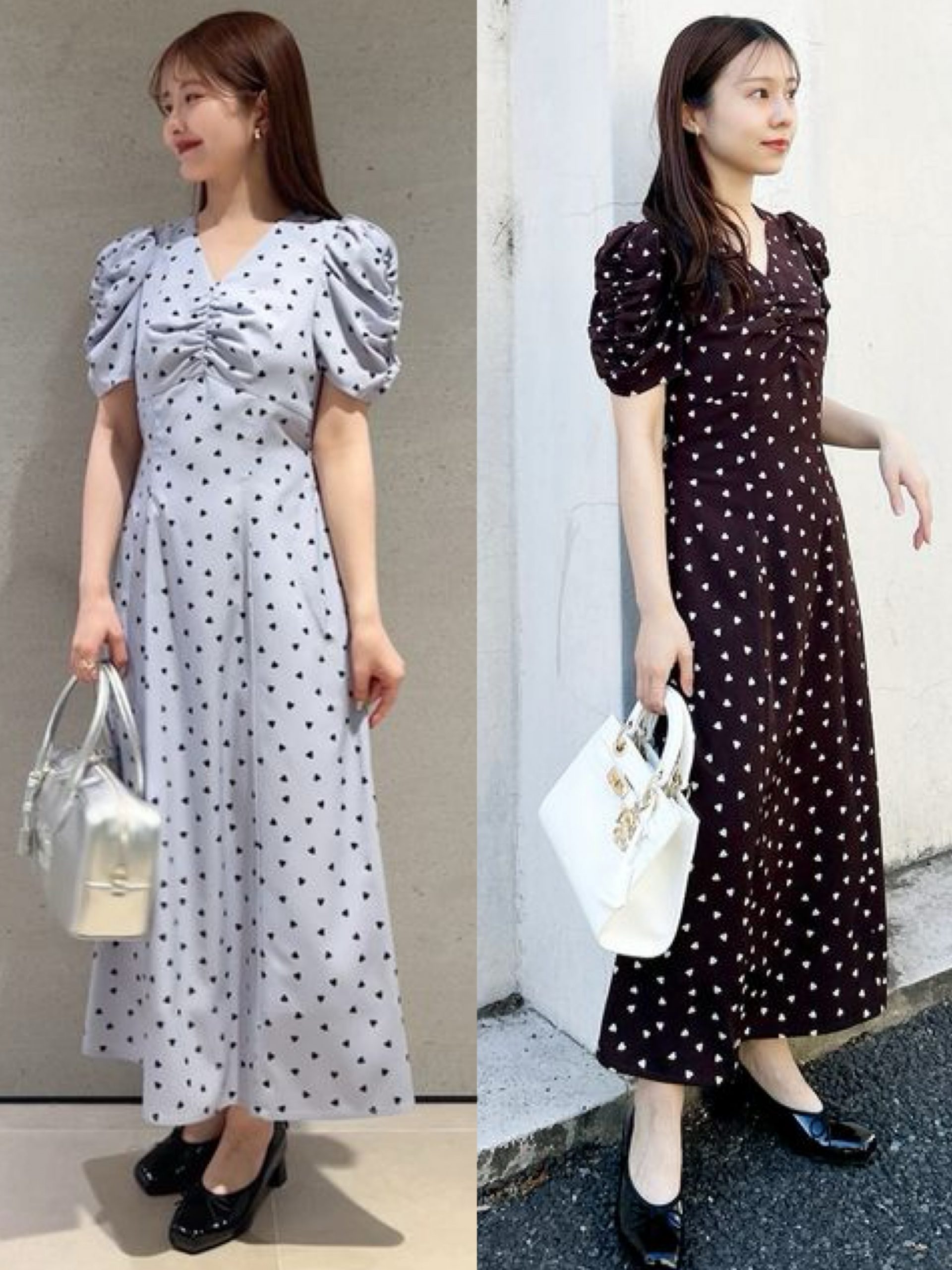 人気のSNIDELらしいハート柄のロングワンピースと合わせたカット。ポインテッドよりも柔らかい雰囲気に。