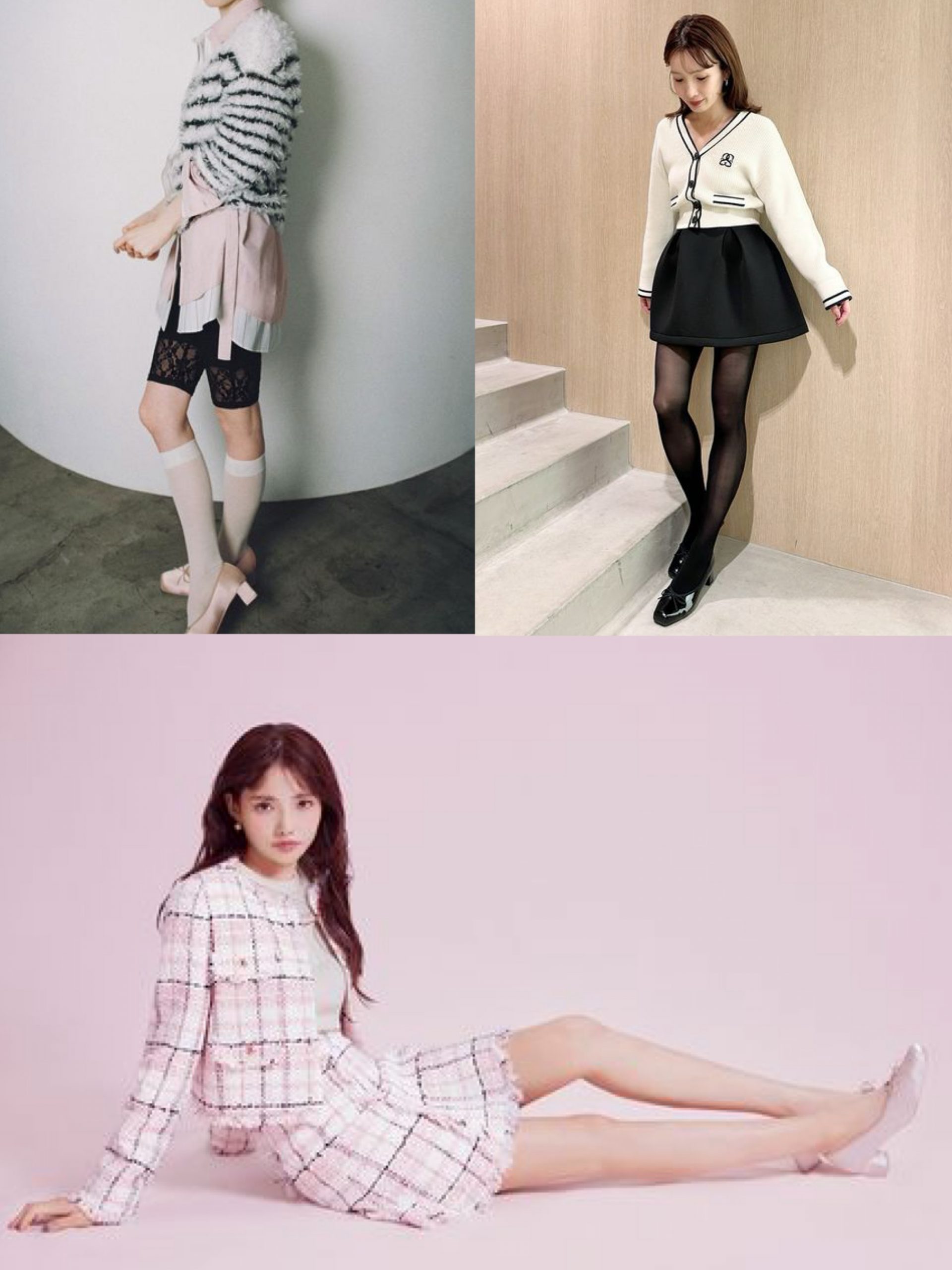 こちらはミニボトムと合わせたコーデ。靴下やタイツとも相性がいいので、トレンドのバレエコアっぽいムードではきこなせます。