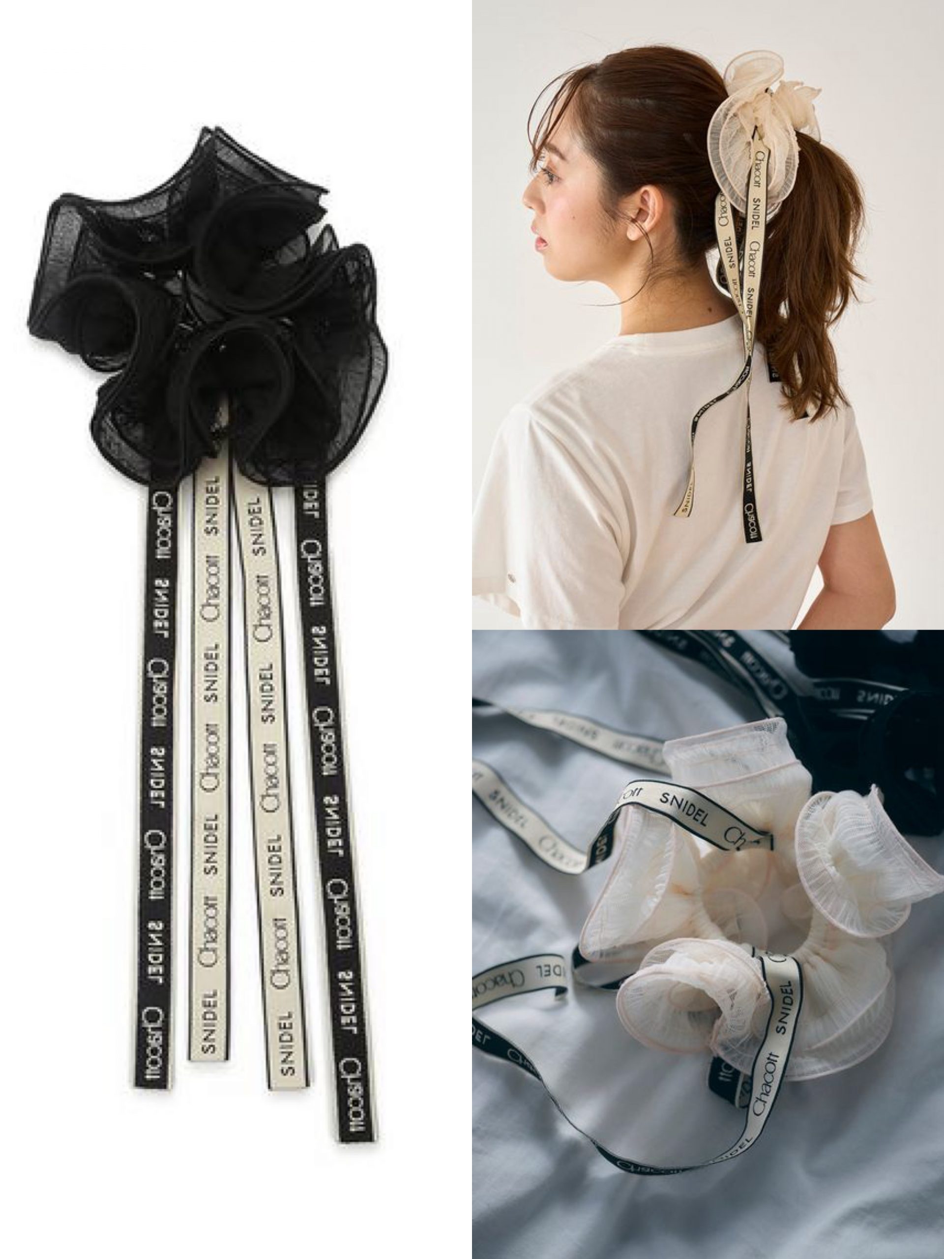 ヘアアクセサリーとして、リボン付きのシュシュが登場。ブレスレットとしても使えます。【Chacott】コラボシュシュ/SNIDEL