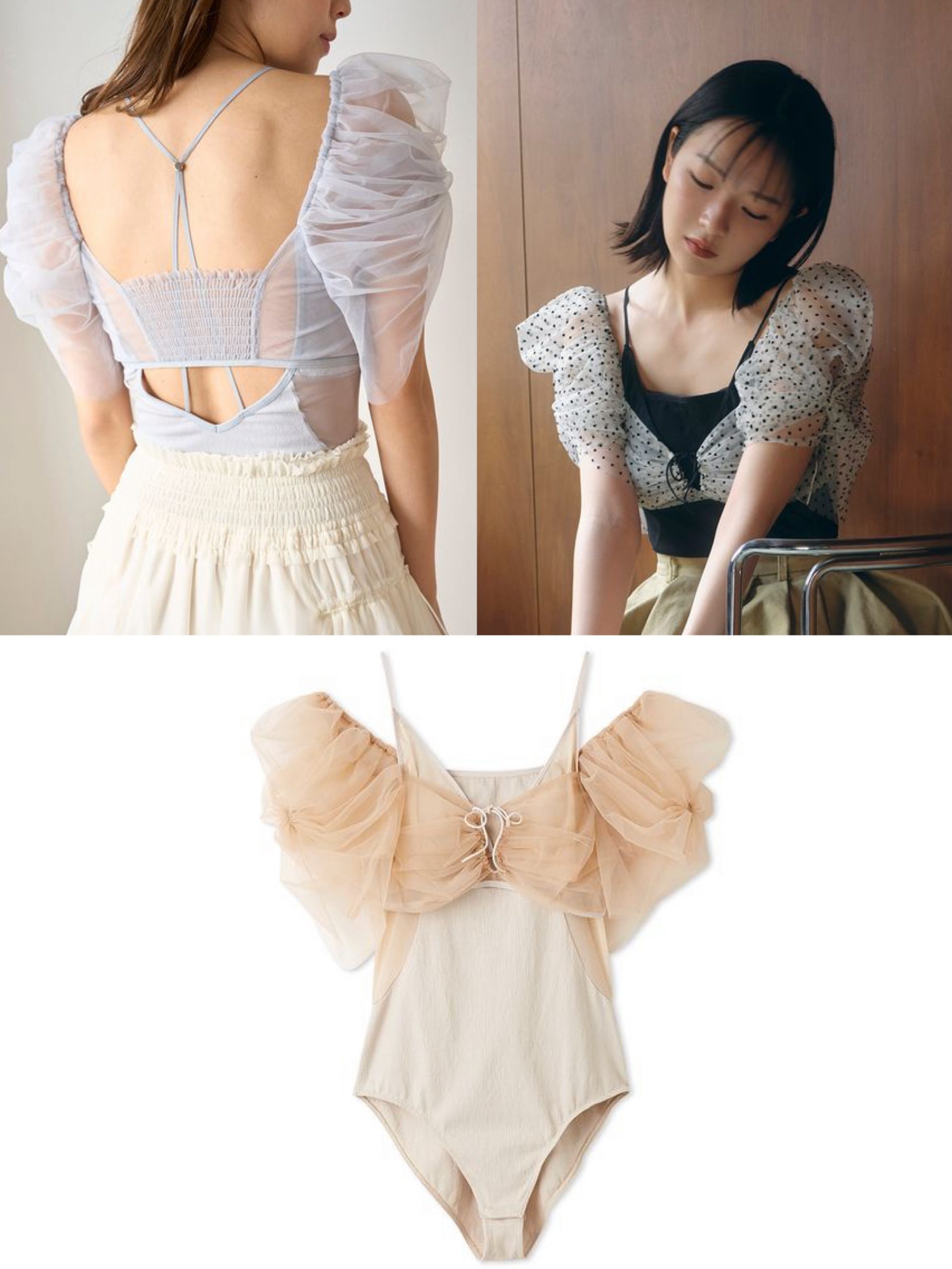 センシュアルなレオタード風ボディスーツもあり。チュールのボレロはオフショルにも着こなせます。【Chacott】レースボディスーツ/SNIDEL