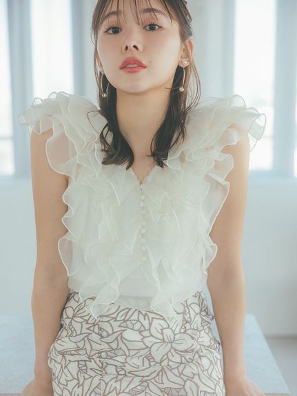ふわっふわなオーガンジー素材のトップス。ノースリフリルブラウス/SNIDEL