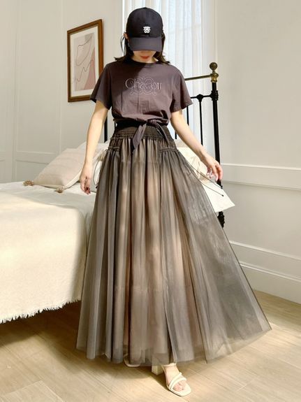 チュールスカートは絶対的に合わせやすい。トップスはシンプルめにするのがおすすめ。チュールギャザーフレアスカート/フレイアイディー