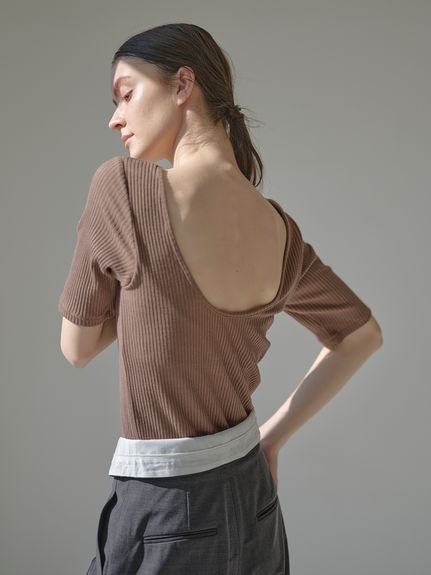背中が広くあいた、センシュアルなリブニット。ハーフスリーブリブトップス/UNDERSON UNDERSON