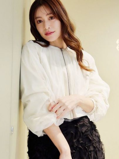 繊細なチュール素材がバレエコアっぽい、コンパクト丈のブルゾン。サテン地に無地とラメ入りの二種類のチュール素材を重ね、それぞれの素材が透ける奥行きのある見え感が素敵。さっと羽織れる便利アイテムながら一枚でさまになるり、ハイウエストパンツやボリュームスカートとのコーディネートがおすすめ。
