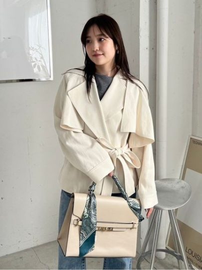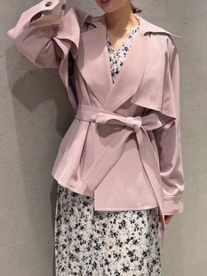 ショート丈のトレンチコートは、肩の部分を取り外せてジレやショートボレロに変化させられる3way。ウエストベルトをきゅっと絞ればふんわりとしたシルエットに。大きな衿は小顔効果も。