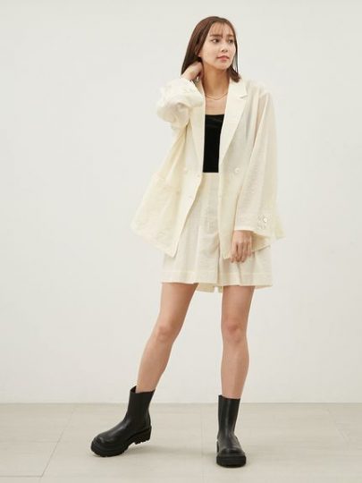 春先の羽織りにぴったりのシアーな素材のコンパクトなブルゾン。身幅、袖幅はゆとりがあり、何にでも合わせやすいのが特長。軽やかで美しいシアーな素材は、凝ったレース使いがラグジュアリー。高級感あるドットと小花柄が入ったチュールレースに、さらに切り抜いたレースをパッチワークしています。