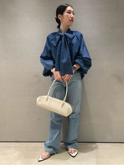 ボウタイを取り外しできる、便利な2WAYタイプのデニムブラウス。タイを外すと、シンプルなバンドカラーのブラウスになって、ガラリと雰囲気を変えられます。袖口まわりはゴム仕様で、たくし上げればパフスリーブに。シェルボタンもレディな印象です。