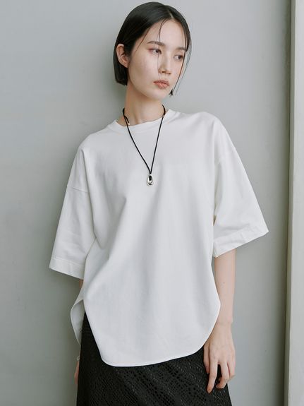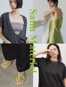シンプルながら、1枚着で構築的なシルエットを作ってくれるミースロエのサテントップス。やや肉厚な生地なので、高見えします。サテン切り替えカットソートップス/ミースロエ