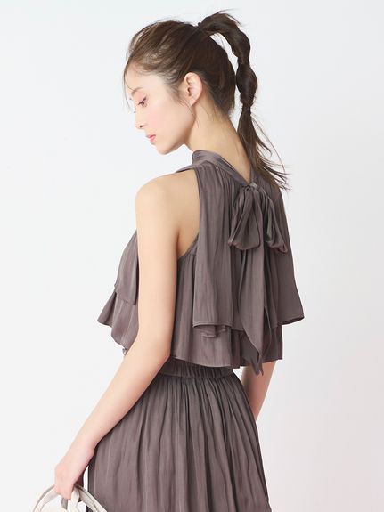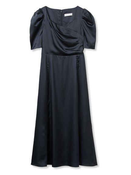 サテン素材でフォーマル見えするものを探すなら、CELFORD。上半身部分をタックやギャザーで立体的に見せてくれるので、上品な印象に。綺麗なデコルテ見せで、特別な夏の日を楽しんで。カシュクール風ナローサテンワンピース/CELFORD