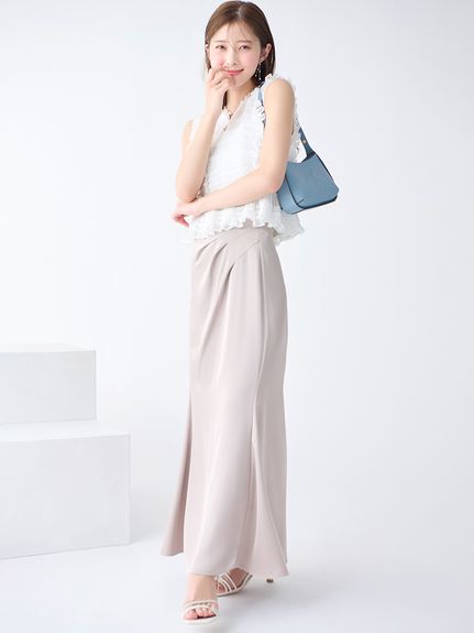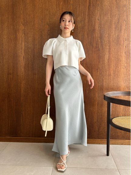 こちらはドレープのアレンジが効いた、CELFORDのナロースカート。繊細な色味もフェミニン。ドレープタックサテンマーメイドスカート/CELFORD