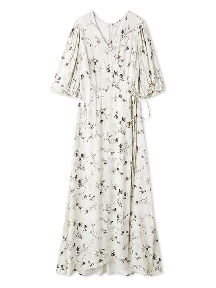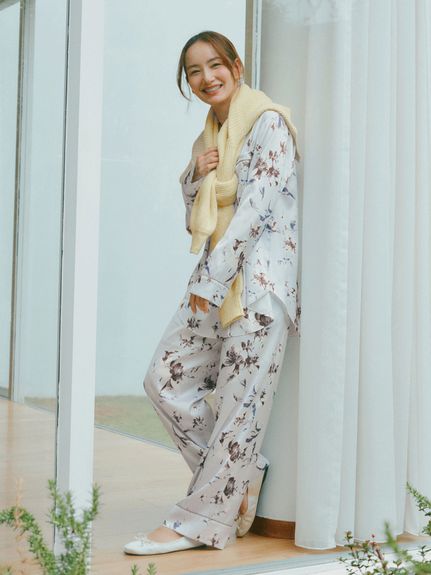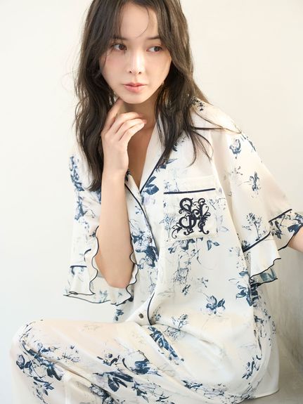 優雅なフラワー柄がプリントされた、サテンルームウエア。フリルもエレガント。肌に触れると冷んやりとしてするので、よく眠れそうです。【Luxshine】プリント開襟シャツ/スナイデルホーム