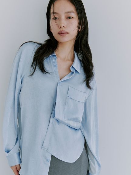 羽織がわりに使える、薄手でシボ感のあるサテン生地のシャツ。清涼感のあるカラーもポイント。 BACKシアーサテンシャツ/ミースロエ