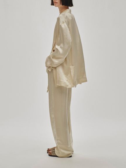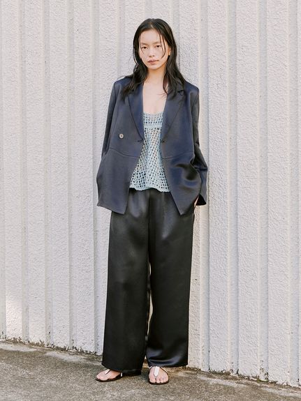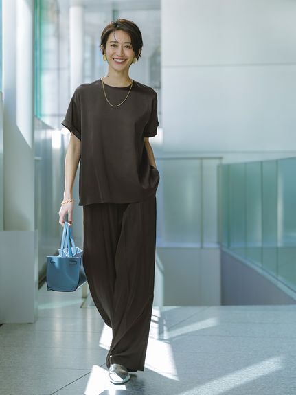 マットな艶めきをもつサテンパンツは、大人に似合うアイテム。フォーマルにもカジュアルにも合わせられるので、足元サンダルでもグラマラスな印象に。リラクシーサテンパンツ/ミースロエ