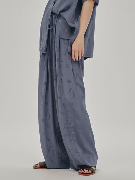 繊細なツバメ柄が織り込まれた、ヴィンテージ風の風合いが大人なパンツ。色も質感も涼しげ。Swallow Satin Pants /TODAYFUL