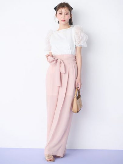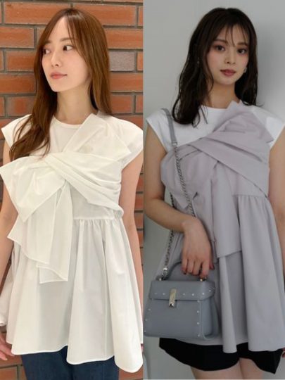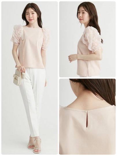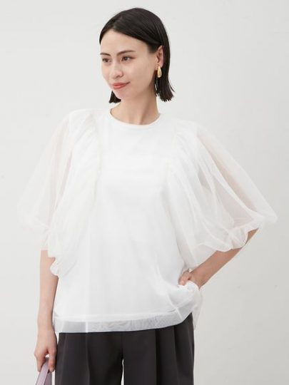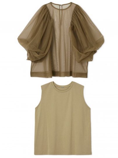 こちらは番外編といった感じですが、パフスリーブのチュールトップスと、ノースリーブのカットソー、2枚セットのアイテムをご紹介。レイヤードして着ると、袖の部分だけが上品に透けるのが素敵。完全にセパレートになるタイプなので、2枚を別々に着ることもできて、スタイリングの幅が広がります。