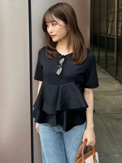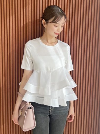 肌触りの良い軽やかなカットソー生地に、艶やかなオーガンジーをドッキングした異素材MIXなデザイン。広めの襟ぐりや長めの袖丈がカジュアルさを軽減。オーガンジーを使用したペプラム部分は、フレアのシルエットが出るようバターンのこだわり、裾にチュールを挟むことで360度どこから見ても華やかにキマります。