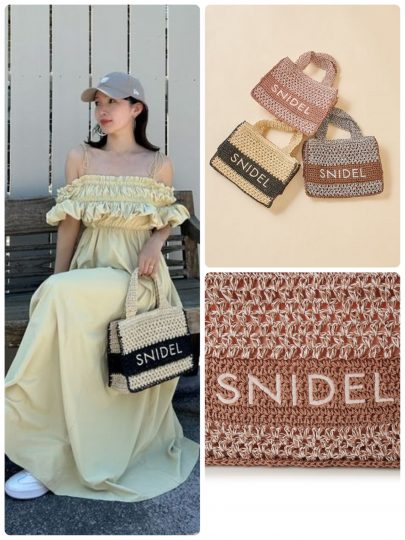 まずはざっくりとした編み地が可愛いSNIDELの新作バッグから。涼しげな印象を与える手編みのボディで、軽やかな雰囲気を演出します。大きくあしらったSNIDELのロゴ刺繍もポイント。