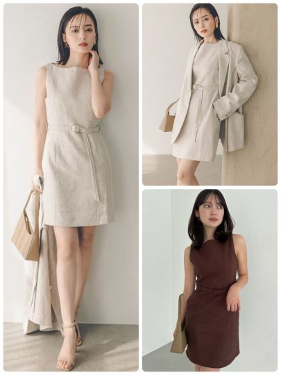 大人っぽい印象を与えるカギはボートネックと華奢な肩まわりのデザイン。甘さを抑えたボックスシルエットもポイントで、落ち着いた雰囲気を印象付けられるんです。セットの同じ生地で仕立てた細ベルトでウエストマークすれば、グッとスタイルアップ効果が期待できそう。通勤もOKなデザインです。