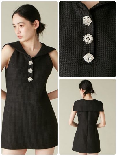ガーリーなイメージが強いセーラーカラーですが、天巾を内側に入れ込むことで大人っぽい印象に。1枚で着こなすのはもちろん、同時期に発売するフレアパンツとのコーディネートもおすすめなので要チェック。きらめくビジューボタンもポイントです。