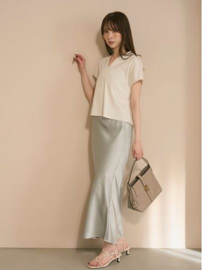 接触冷感のナロースカートは、リサイクルポリエステルの糸を使用したサテン調の素材で、体のラインを拾いにくいのがポイントです。また、バイアス仕様でウエストに切替えを入れないことにより、よりすっきりとした大人っぽい印象に。