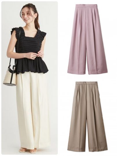 軽い着心地で着回し力抜群なきれいめサテンワイドパンツ。光沢感とドレープ感が特徴の素材は、接触冷感、吸水速乾、手洗い可能のハイスペックさ。程よいワイドシルエットでトップスとバランスが取りやすく、真夏のコーディネートに抜け感と軽やかさを与えてくれます。センタープレス入りできちんと感をキープしつつ、後ろウエストにはゴムを通しているからリラックスした着心地。