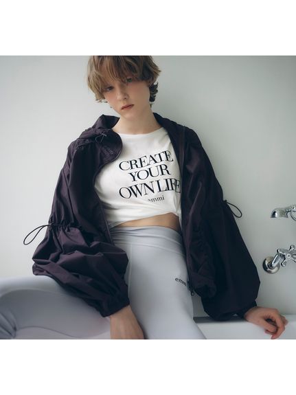 畳んで持ち運べる、ライトなブルゾン。残りはブラウンのみ。ギャザーのくしゅくしゅ具合を自分で調整できるのもいい。【ONLINE限定カラー】ギャザーナイロンブルゾン/emmi