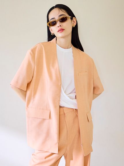 お仕事にも◎なハーフスリーブののノーカラージャケット。UVカット機能、接触冷感と機能も充実。セミシアーハーフスリーブジャケット/emmi
