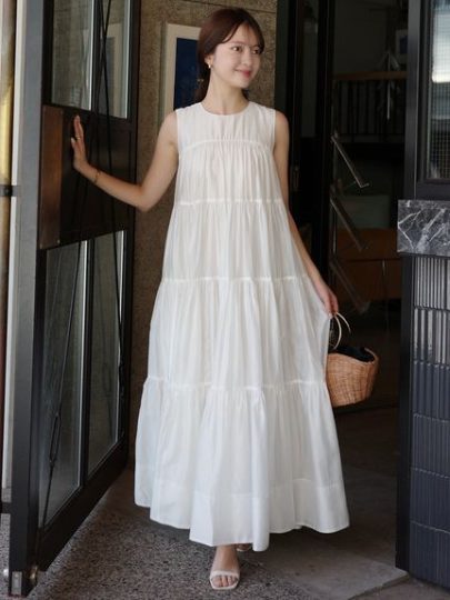 上品な光沢と、なめらかな風合いのシアー素材を贅沢に使用したワンピース。たっぷりとギャザーを寄せたティアードデザインが動くたびにふわりと揺れ、女性らしさを引き立ててます。軽やかな素材なので、大人のリラックススタイルにもぴったり。ホワイトは肌に近い色の裏地付きで、1枚で着ても透けにくい点もポイントです。