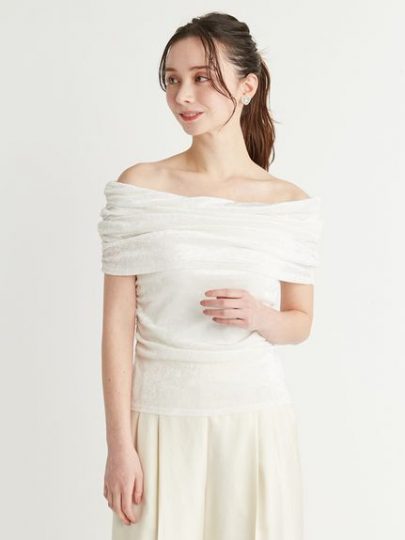 シアー感のあるベロア素材で、シーズンムードを高めてくれる1着です。肩にかかるような襟ぐりにしており、女性らしい上品な肌見せが叶います。両脇にもギャザーを入れて、気になるおなか周りをカバー。インでもアウトでも1枚で決まるアイテムです。