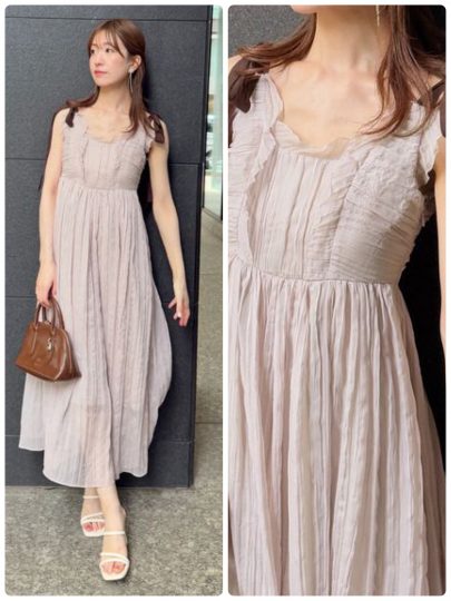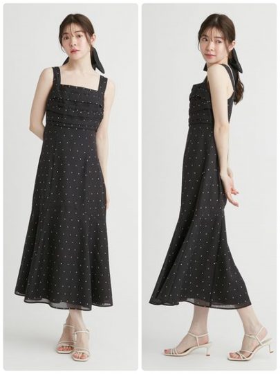 憧れのモデル、美香さんコラボのドレスは、オーガンジー素材を使用した大きめのリボンと、胸元のプリーツタックデザインが一枚で着映えするデザイン。適度なシボ感のあるシアー素材に、大人の甘さ漂うドット柄をプリントしました。肩のリボンは取り外しが可能です。