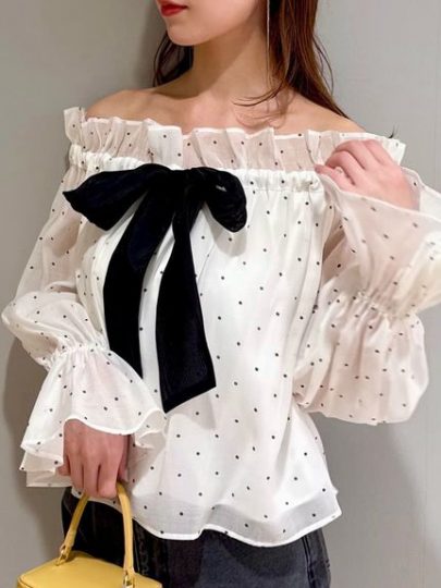 リボンをきゅっと絞るとスタンドカラーに、緩めるとオフショルとして着ていただけます。上品な透け感のある素材や、広がりを持たせたスリーブデザインも手伝って、女性らしい印象に。襟周りにはたっぷりギャザーを寄せてボリュームを出すことで、小顔効果もねらえる1枚です。