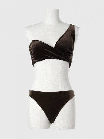 高級感のあるベロア地に、ワンショルダーにねじりのアクセントを加えたスイムウェア。伸縮性のある素材でお作りしているので、ホールド感があり安心してご着用いただけます。取り外し可能なストラップも付いているのでお好みで雰囲気を変えてお楽しみ下さい。
