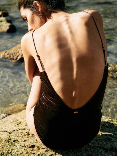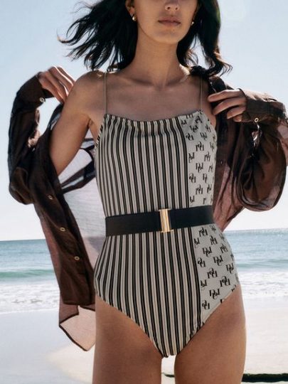 バックオープンのワンピースにウエストベルトがスタイルアップを叶えてくれるスイムウェア。ヘルシー感のある華奢な肩紐と微光沢のサテンゴムを使用したウエストマークのベルトは、それぞれサイズ調整が可能です。ベロア地にゴールドのバックルがアクセントになり上品さを引き立てます。