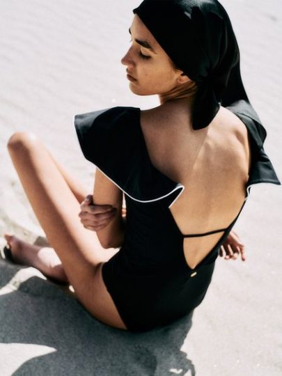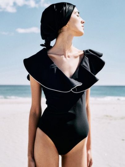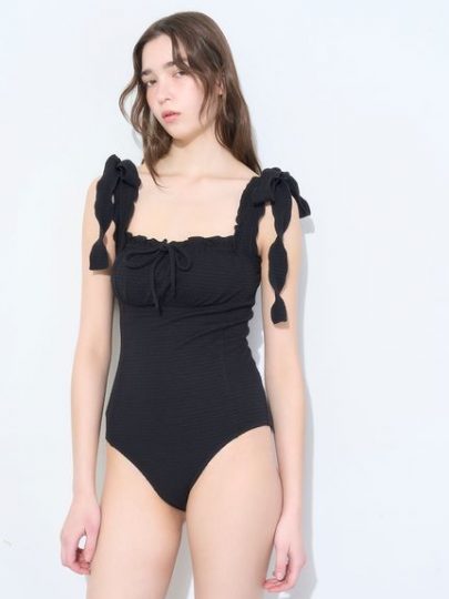 大胆なフリルが目を惹くワンピースデザインのスイムウェア。フリルの端にはパイピングがあしらわれていて、立体感があり華やかな印象を際立たせてくれます。しっかりとした素材感でボディラインを拾いすぎず、安心してご着用いただけます。フリルが二の腕をカバーしてくれるのも嬉しいポイント。