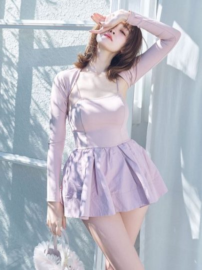 ワンピース型の水着とラッシュガードがセットになったスイムウェア。カシュクールの長袖ラッシュガードは、クロップド丈なのでスタイルアップ効果も抜群。ワンピースはフロントにSNIDELロゴテープを添えて、リッチ感を出しました。胸下には切り替えを入れてメリハリを出し、ボディラインを美しく見せてくれます。同色のボトムス付きです。