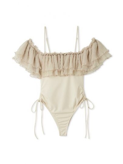 大きなフリルが目を引くワンピースタイプ。フリル部分は肩の上に乗せても、オフショルにしても着用いただける2WAYです。サイドにはドロストリボンデザインを加えて女性らしく仕上がりました。肩紐は取り外しが可能です。