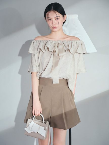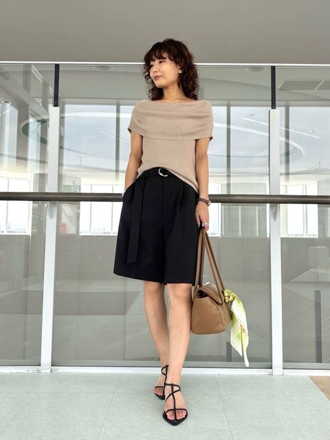 ハリ感のある、上品なキュロットデザイン。上品なオフショルブラウスで女っぽく。