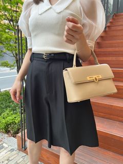カジュアル見えするショートパンツには、同じテンションのラフなものよりブラウスやシャツといったフェミニンなものや綺麗めなアイテムと合わせるのが大人見えさせるコツ。